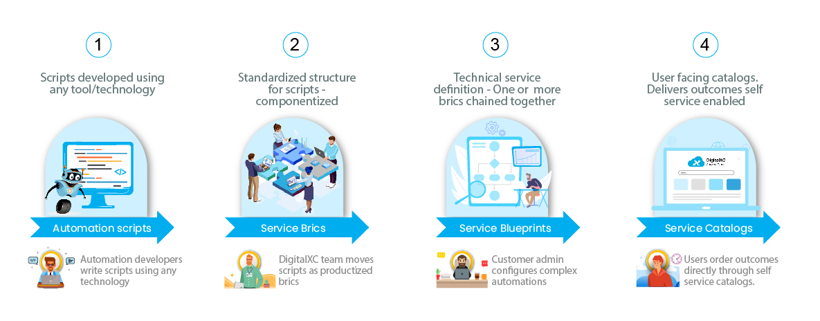DigitalXC platform comes with a Software Defined Services Layer – This is an abstraction layer that delineates service definition and configuration from service execution. By abstracting the implementation and delivery details it enables enterprises to build complex services spanning multiple tools and platforms. It enables plug and play operation where service configuration is centrally maintained in the catalog and is sent to service delivery layer in run-time. Software Defined Services layer significantly enhances enterprise agility and service delivery maturity. Design, build and deliver services at scale.